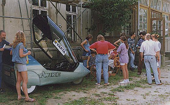 Die Fahrer des zweiten Twike, Martin Möscheid und Techniker Bernd, stellen sich den vielen neugierigen Besuchern. Martin ist Mitinitiator des im Aufbau befindlichen internationalen Stromtankstellen-Netz für Leicht-Elektromobile LEMnet .