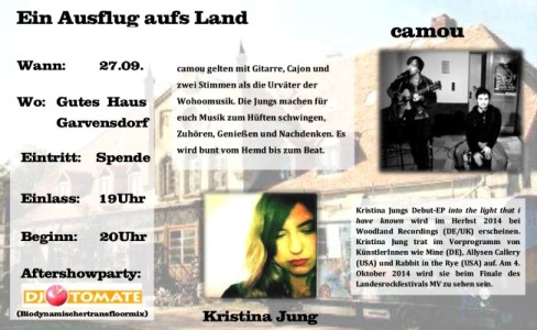 Zuhören, Genießen und Nachdenken. Es wird bunt vom Hemd bis zum Beat. Musik hier auf soundcloud Kristina Jung ... schreibt "epic Folk" mit Einflüssen von klassischer Musik und Blues. Sie trat in Deutschland und den USA auf und war "Artist in residence" an der Colgate University. Ihre Debut-EP "into the light that i have known" wird im Herbst 2014 bei Woodland Recordings (DE/UK) erscheinen. Am 4.Oktober 2014 wird sie beim Finale des Landesrockfestivals MV zu sehen sein. Musik hier auf soundcloud |