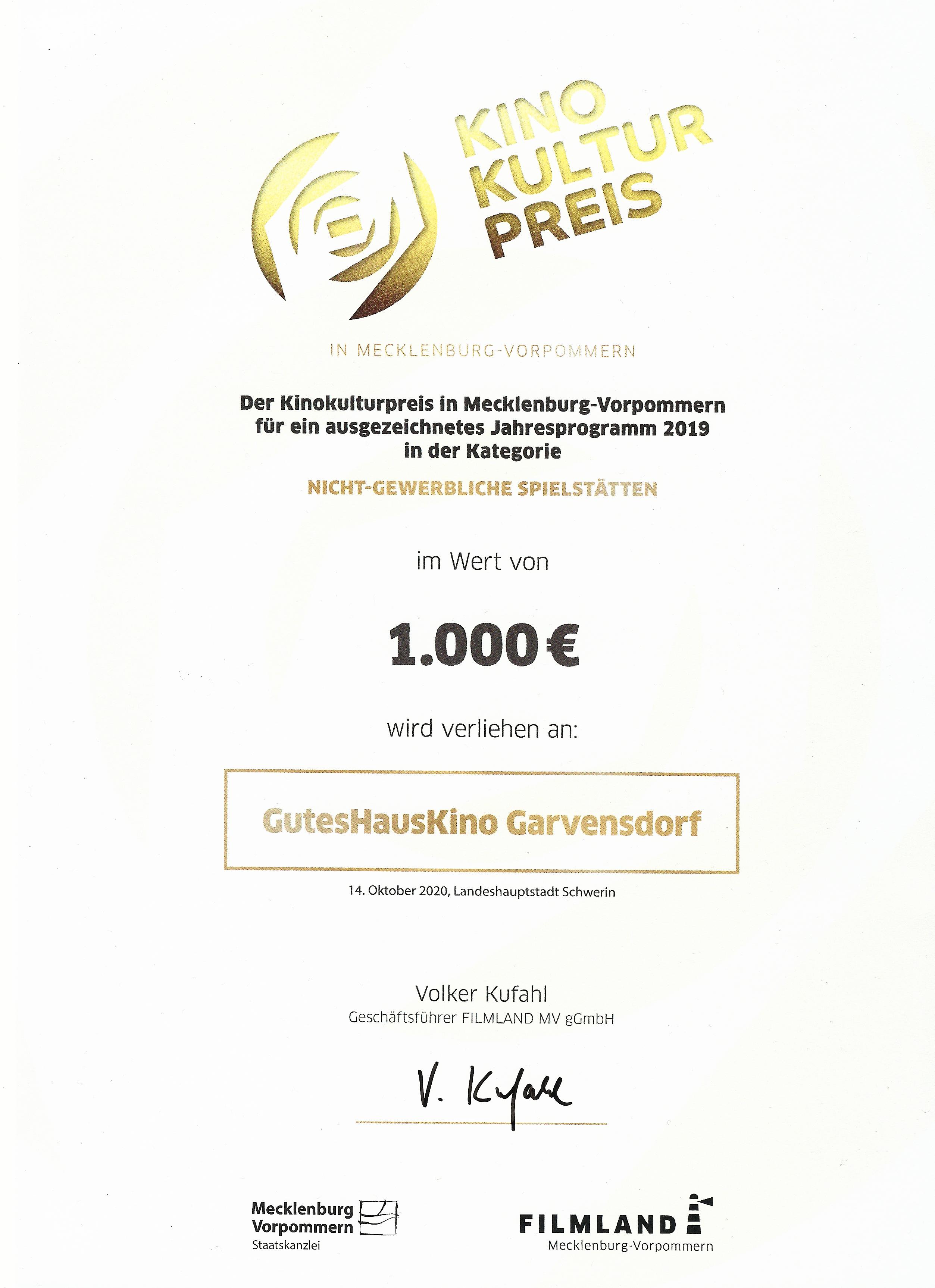 GutesHausKino erhielt am 14.10.2020 für sein "ausgezeichnetes Jahresprogramm 2019" als eines von 12 nichtgewerblichen Kinos in MV im Capitol Schwerin zum zweiten Mal den KinoKulturPreis MV 2020Zur Preisverleihung waren Holger Meyerund Klaus Ohde vom Vorstand angereist. Wir freuen wir uns darüber, dass das Preisgeld von 1000¤ kurzfristig nochmal um 500¤ aufgestockt wurde. Nun hoffen wir nur, dass wir damit auch loslegen können. Das Filmfest ruht zunächst (s.u.)... |