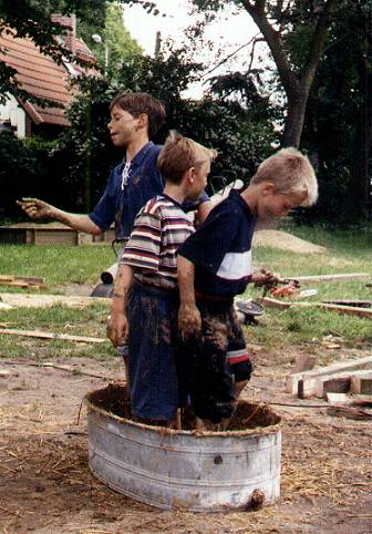 Durchgemengt wird das Ganze am besten mit den Füßen. So spart man Zeit und Geld um aufwendige Maschinen zu besorgen. Größere Steine sollten mit Rücksicht auf das Gewölbe und auf die Füße entfernt werden.