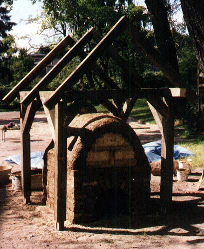 Der Ofen benötigt keinen Schornstein und kann somit an jeder beliebigen Stelle im Freigelände errichtet werden. Da der Ofen mit Lehm vermauert wird, ist eine Überdachung unbedingt notwendig. Sollte also kein Schleppdach oder Ähnliches vorhanden sein, muß der Ofen im nachhinein vor Regen geschützt werden.